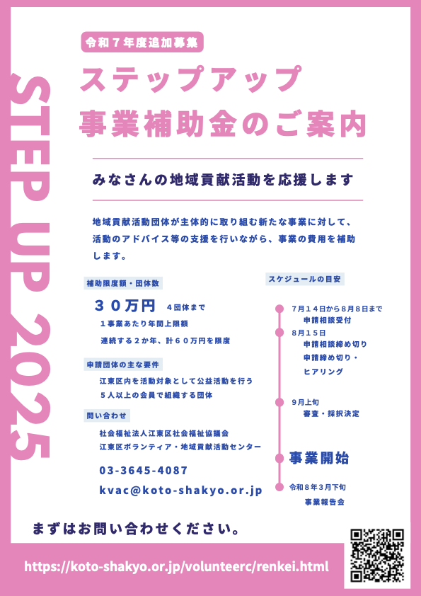 2025/09/01江東区のステップアップ補助金に採択江東区のステップアップ補助金に採択江東区のステップアップ事業補助金(Link)に採択されました。期間は、2025年9月2日から2027年2月28日(2年度分)です。江東区ボランティア・地域貢献活動センターのご協力をいただきながら、より良い活動にしたいと思います。事業実施報告会(第一回)を2026年3月16日に実施予定です。報告の内容については、こちらのWebサイトでもご案内いたします。執筆:伊藤真一←ホームに戻る